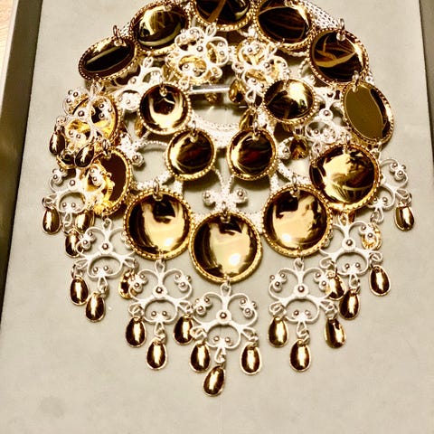 Sylvsmidja bunadsølv i sølv og gullbelagt materiale, designet for dame. Tradisjonelt norsk bunadsølv med detaljer i gullfarget metall.