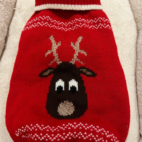 Hundegenser i rød farge med juleinspirert mønster bestående av reinsdyr og snøkrystaller. Genseren har ribbestrikket hals og kant, og passer til små hunder. Materialet er strikket tekstil.