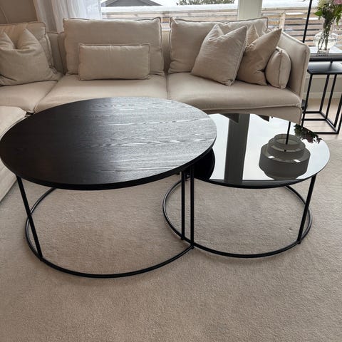 Pent brukt stuebord med metallramme og mørk bordplate