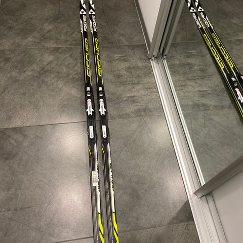 Fischer langrennsski i svart og gul farge. Fortsatt mye bruk igjen