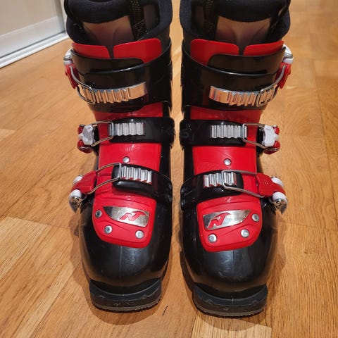 Nordica alpinskistøvler i størrelse 25,5 med rød og svart farge. Støvlene har flere spenner for justering og støtte.