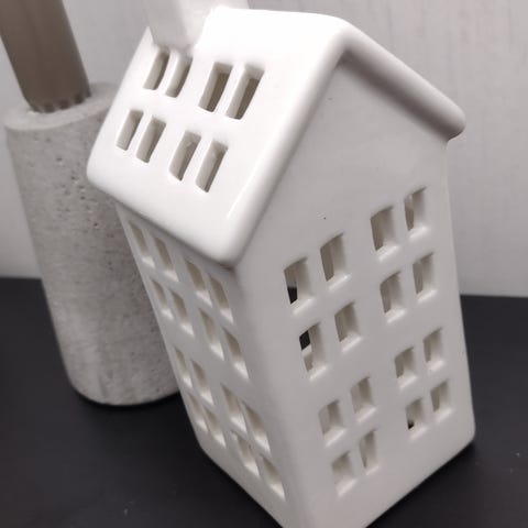 Lyshus/dekorasjonshus i keramikk med plass til telys. To forskjellige størrelser og farger med detaljer som vinduer og dører. Egnet som dekorasjon i innendørs. 100 samlet.
