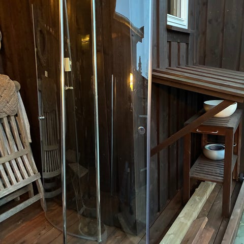 Dusjhjørne med glassdører og krom ramme. Inkluderer dusjarmatur med hånddusj og termostatstyrt blandebatteri. Passer til hjørneinstallasjon i baderom.