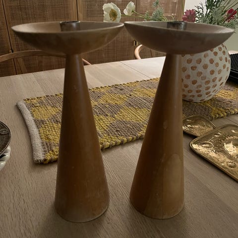 Kjempefint lysfat i tre, med to telysestaker i mangotre, og en liten uekte plante. Samlet 70 kr.