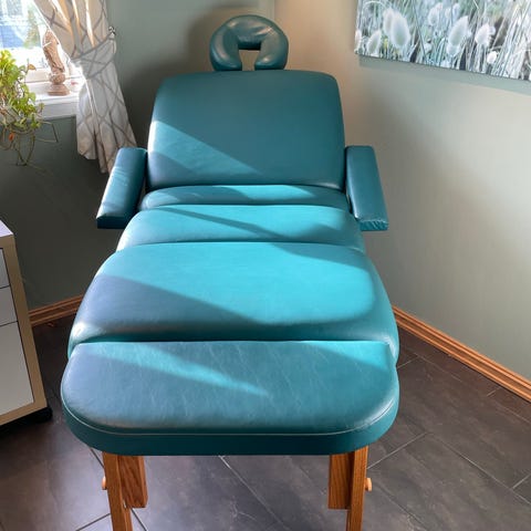 Behandlingsbenk med justerbar ryggstøtte og beige polstring
