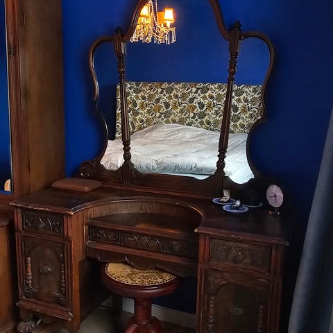 Vintage sminkebord i tre med speil og skuffer