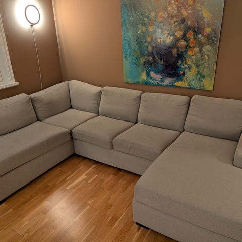 Kraftig sofa i beige farge.