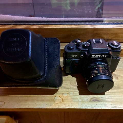 INF kamera med klassisk design. Kameraet har et kompakt format og et mekanisk utløserhåndtak. Det er laget i metall og har en svart finish med gullfargede detaljer. Passer for samlere og brukere som ønsker et vintage kamera.