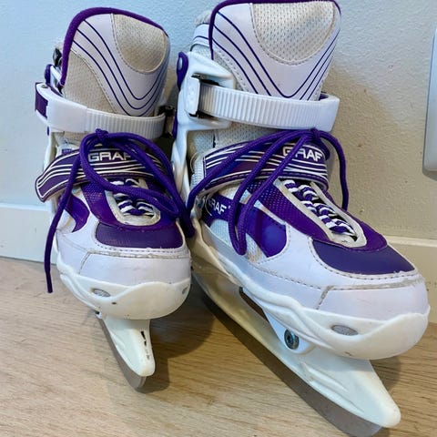 Selger Graf justerbare skøyter til barn i str 35-38 i hvit og lilla farge. Skøytene er litt små i størrelsen.