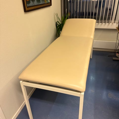 Behandlingsbenk med justerbart hode- og armlene. Hev/senk må fixes.
