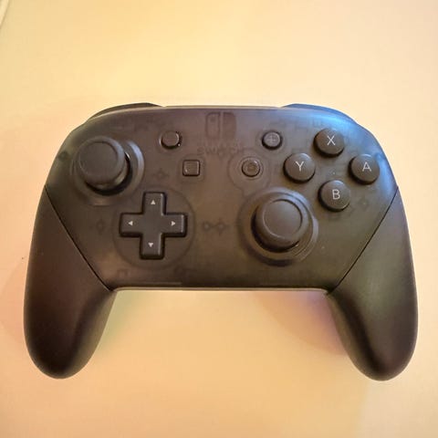 Nintendo Switch Pro-kontroller i svart farge. Trådløs spillkontroller kompatibel med Nintendo Switch-konsollen. Utstyrt med to analoge spaker, D-pad, fire handlingsknapper, skulderknapper og en USB-ladekabel inkludert.