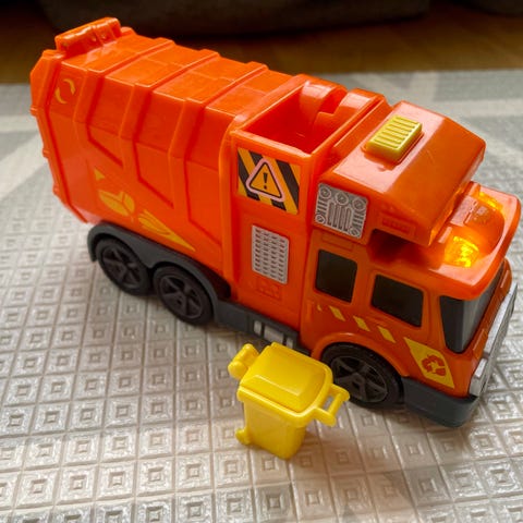 Søppelbil som ny, bilen kjører fremover og bakover når den trykkes og gir fra seg signaler. Det er en søppelbøtte der, den er bare ikke med på bildet.