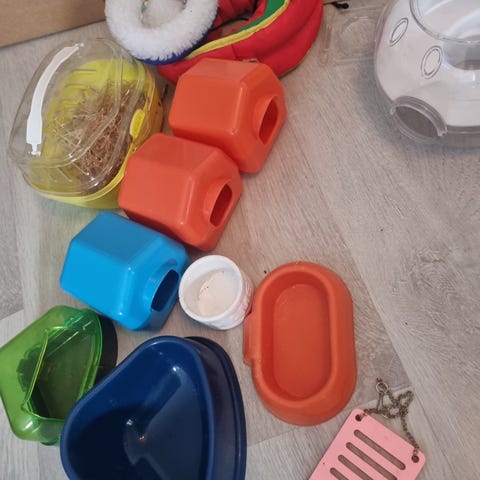 Diverse utstyr til hamster selges samlet. Løpehjul, løpeball, reisebur og lekegrind selges for kr. 400 - resterende produkter følger med på kjøpet.
