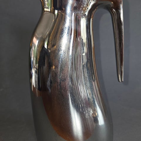 Georg Jensen vannkanne laget i rustfritt stål med en elegant og moderne design. Kan brukes til servering av vann eller andre drikker. Har et håndtak for enkel håndtering og en smal tut for presis helling.