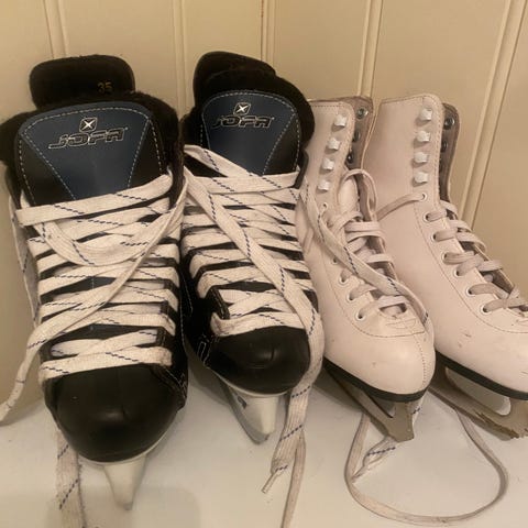 Størrelse 32 på de helt hvite, 32-35 på de rosa, og 34 på hockeyskøytene.