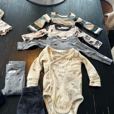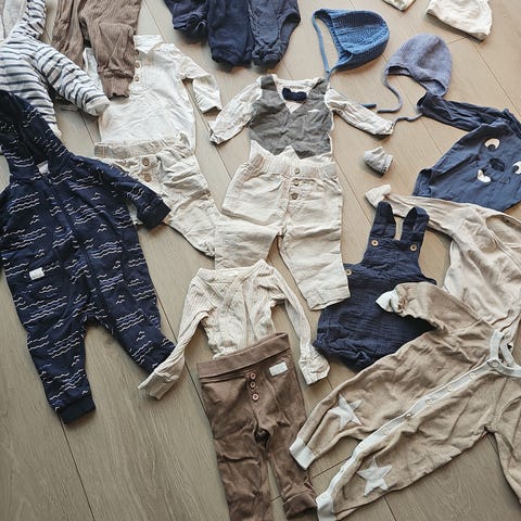 9 skjønne babyplagg, pluss en lue og et par sokker/tøfler. Størrelsene varierer fra 50 til 62, og passer derfor en nyfødt eller noen måneder gammel gutt. Pent brukt, fra et røykfritt og dyrefritt hjem.