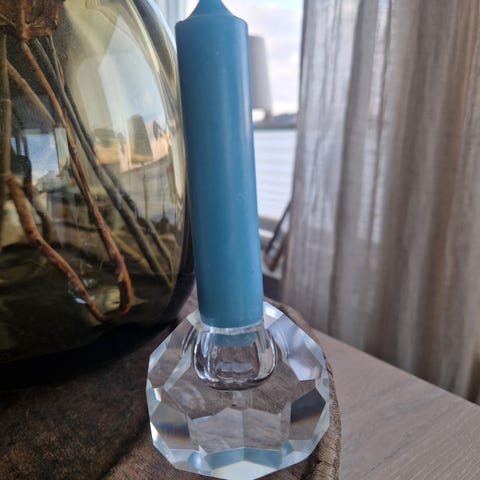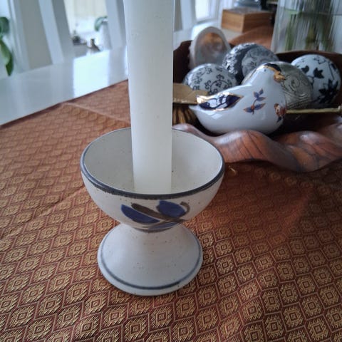 Søt liten lysestake med kjeruber og gulldekor, ca 8-9 cm høy.