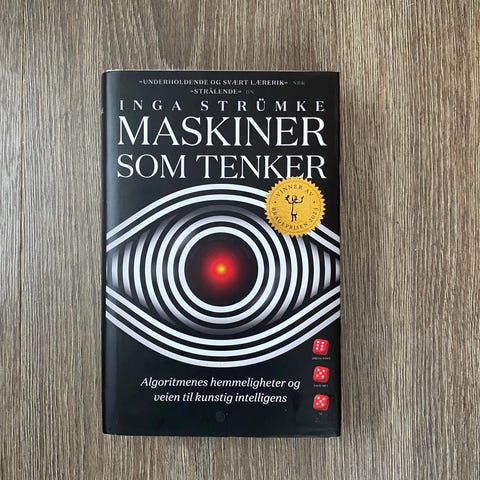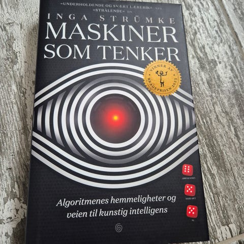 Inga Strømke Maskiner som tenker bok. Boken omhandler algoritmenes hemmeligheter og veien til kunstig intelligens, med fokus på temaer som maskinlæring og kunstig intelligens. Passer for lesere interessert i teknologi og datavitenskap.
