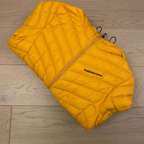 Pent brukt dunjakke fra Peak Performance. Et lite hull inni den ene lommen (vises ikke). Lommen kan fortsatt fint brukes for mobil, pengebok etc, men fint å bruke den andre lommen for eventuelle mynter og nøkler. Kan også enkelt sys for å fikses.