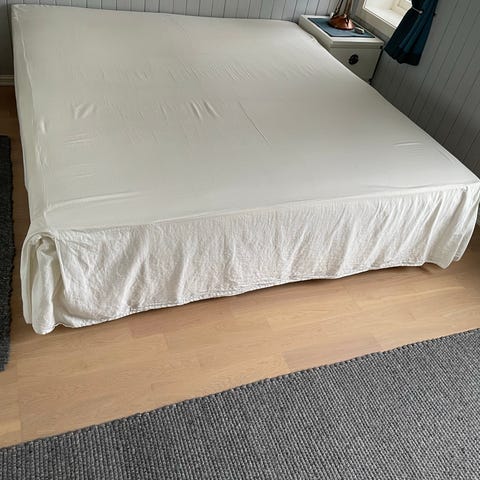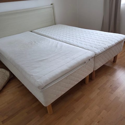 Jensen Ambassadør sokkelmadrasser (nederste del) med sokkel gis bort. Madrassene er 2 stk 90x210 cm, som plasseres på en 10 cm høy sokkel.