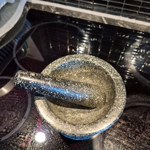 Settet består av to mortere og støtere laget av messing. Den største morteren er omtrent 9 cm høy, og den minste er 5 cm høy. Begge har håndtak på sidene for enkel bruk. Settet er egnet for å knuse og male krydder eller urter. Lett brukt, i nesten ny stand.