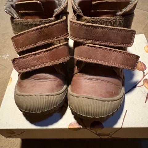Kavat høst/vinter/vår støvler størrelse 24 med ullfor. Godt brukt, men mye bruk igjen. Gode såler med minimal slitasje, men lite hull i ytterlæret oppå den ene støvelen (se bilde). Ingenting å si for bruk.