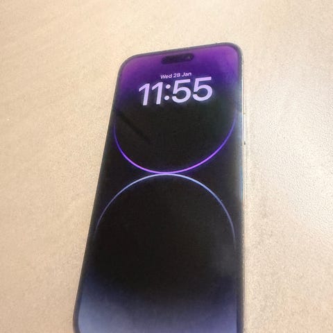 Apple iPhone 14 Pro mobiltelefon med 128 GB lagringskapasitet. Enheten har svart farge og inkluderer funksjoner som optimalisert batterilading og dynamisk ytelse. Telefonen er i god stand med batterikapasitet på 83%. Hakk i plasten på lader, men den virker helt greit.