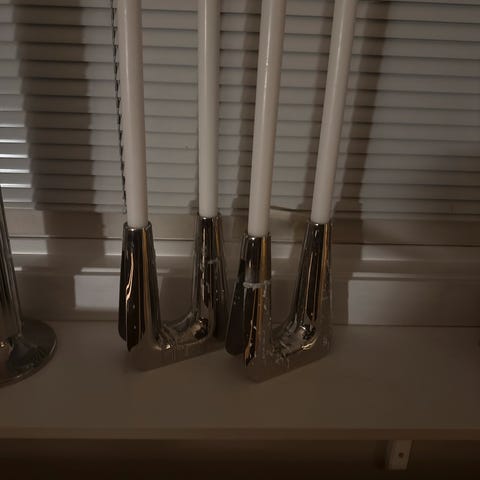 Georg Jensen lysestaker i sølv. To stk med organisk form, designet for å holde telys. Materiale i polert sølv, egnet for dekorativ bruk i hjemmet.