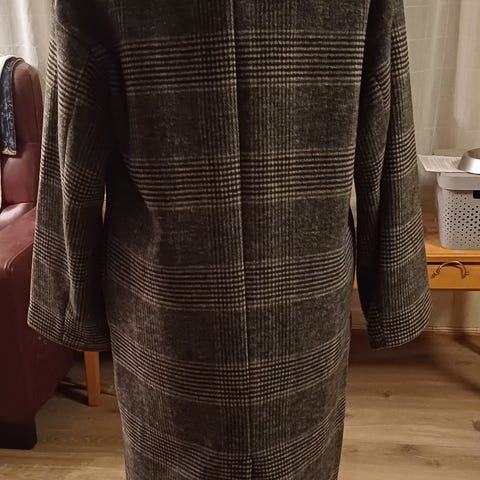 God og varm kåpe. Skinn imitasjon på utsiden og teddyfor på innsiden. Lukkes med hemper. Den har hette og detaljer med pelsimitasjon rundt hette, ermer og nederkant. Merket str 42/44. Str L.