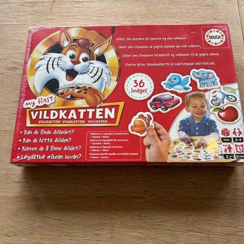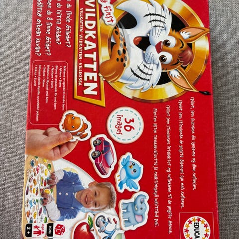 Vildkatten brettspill for barn med 36 brikker og rund spilleflate med ulike illustrasjoner. Passer for barn og kan brukes til å trene observasjon og reaksjonsevne. Gøy spill. Er lite brukt.