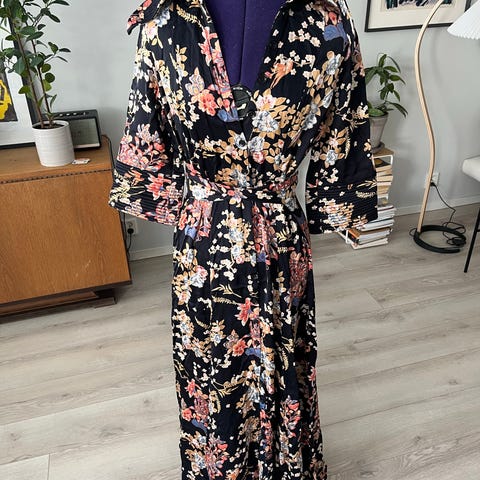 Vero Moda hverdagskjole i størrelse S for kvinner. Kjolen er svart med blomsterprint og laget av viskose. Den har korte ermer og knapper foran, samt belte i livet.