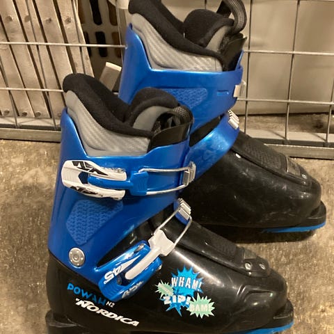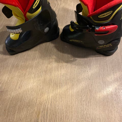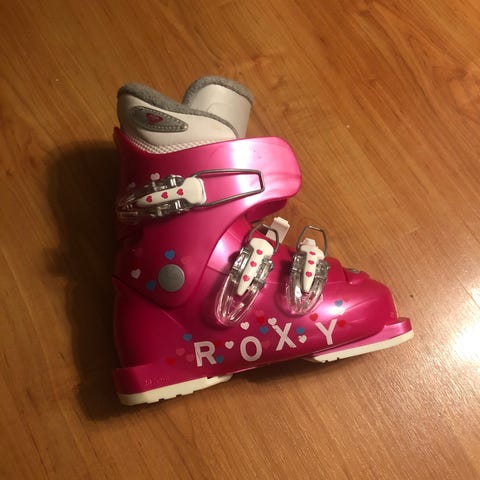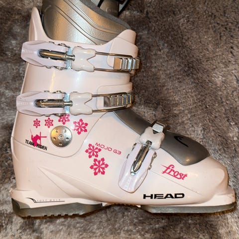 Lange Starlet alpinski støvler i størrelse 21,5 (33-34) med hvit og rosa farge. Støvlene har tre spenner for justering og er designet for barn. Kun brukt en vinter