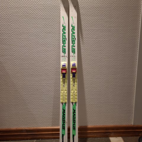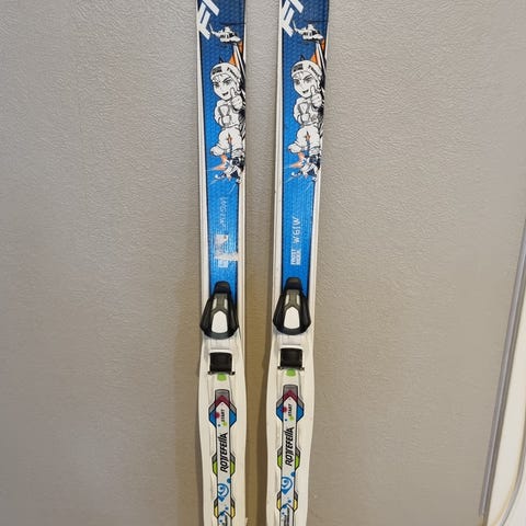 Barnelangrennsski med en lengde på ca 110 cm. Skiene har Rottefella bindinger. Snømannmotiv. Godt brukt, har rester av smøring under.