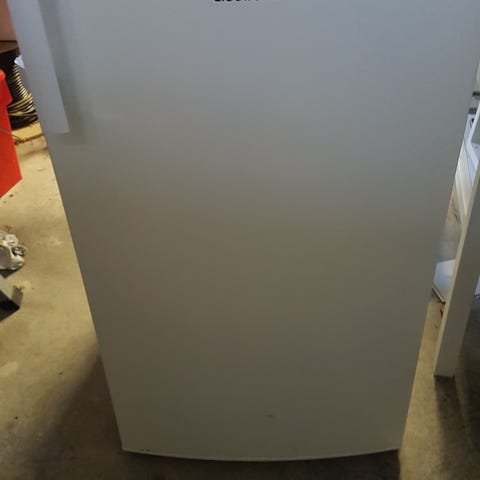 Pent brukt kjøleskap vi har brukt som back-up i boden. Det har en liten bulk på toppen av skapet, ellers kan jeg ikke se skader. Der kjøpt i 2019 og har fungert prikkfritt så langt.