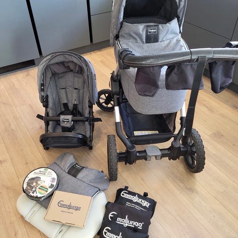 Emmaljunga barnevogn med tilhørende liggedel og diverse tilbehør inkludert. Vognen har justerbart håndtak, stor kalesje og robuste hjul for variert terreng. Liggedelen gir et komfortabelt og trygt sovemiljø for barnet. Tilbehøret inkluderer blant annet en koppholder og en myk, fôret matte. Passer for barn i småbarnsalder.