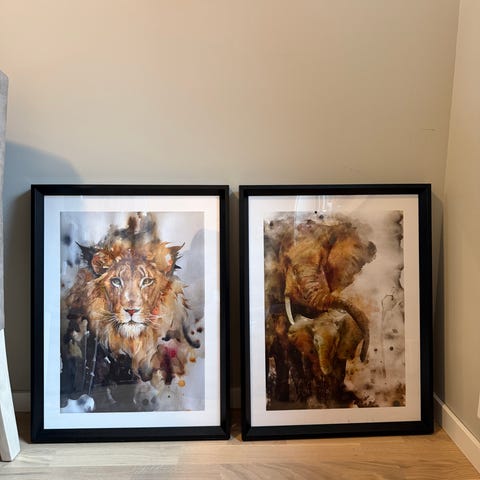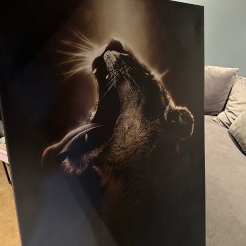 Bohus Lion glassbilde med størrelse 100x100 cm. Bildet er innrammet med herdet glass. Produktet veier 8 kg og er laget av glass og PS-materiale. Farge og design viser en løve på mørk bakgrunn.