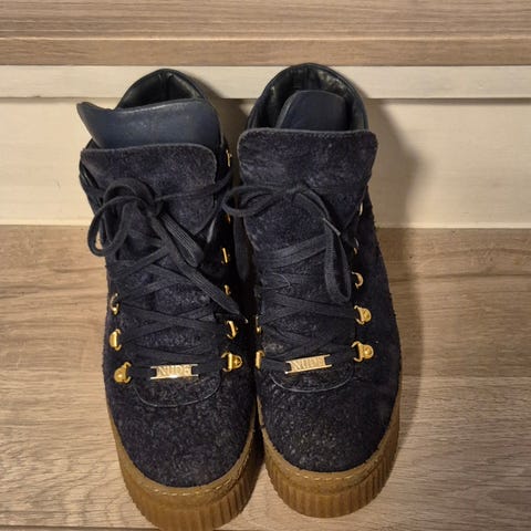 Nude of Scandinavia Vinterstøvler i størrelse 40. Støvlene har en kombinert overflate av semsket skinn og glatt skinn, med svarte farger og detaljer i gull. Sålen er tykk og har et mønster for bedre grep. Egnet for bruk i kaldt vær.