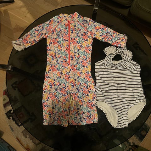 Flytevest til bassenglek og to badedrakter str. 98-104