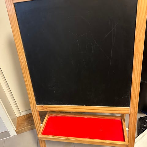 Tavle med white board på en side og krittavle på den andre siden. Godt brukt. En eske med kritt, tusjer og svamp følger med. Mangler en festeskrue i et av beinene, som enkelt kan fikses. Må hentes.