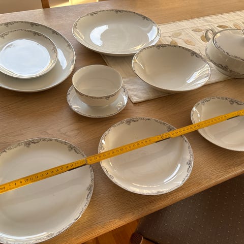 Asjetter og kaffekopper til 8 personer, middagstallerkner til 15 personer