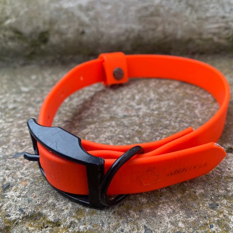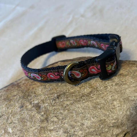 Hjemmelaget halsbånd i unikt design. Passer liten hund. Regulerbar fra 22-31 cm. Leiebånd i samme design, 1,5 m.