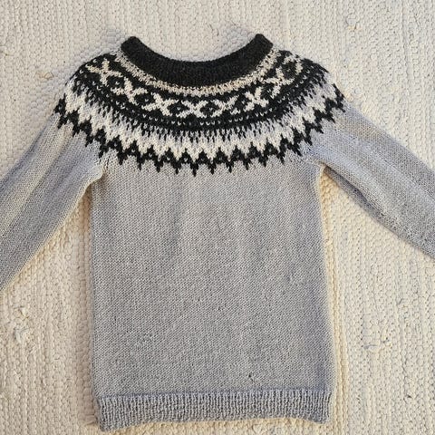 Hjemmestrikket genser. Til gutt og jente. Pent og lite brukt. Passer 4-6 år, tilsvarende str 110. Vasket med ullvaskemiddel.