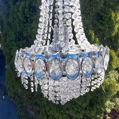 Hvit lysekrone selges (ikke ekte krystaller). Hengt i vår stue. 3 stk lyspærer. Kjøpt ny på lampebutikk for noen år siden, men fikk i gave så vet ikke nypris.