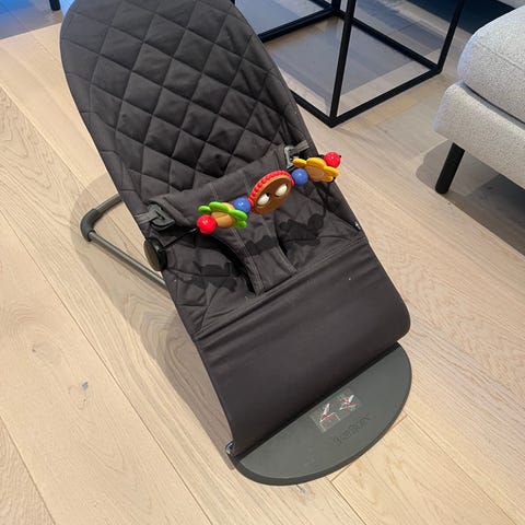 Babybjörn barnestol i grå farge. Stolen har et quiltet stoffmateriale og inkluderer en leke med blomster og sirkel. Designet for barn med fokus på komfort og funksjonalitet. Pent brukt! Avtagbart trekk som kan vaskes i maskinen.