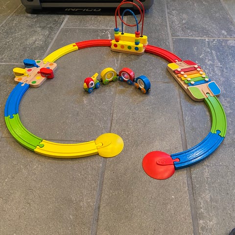 Togbane lekeanlegg med flere etasjer og spor for tog. Lekeanlegget har fargerike illustrasjoner og inkluderer ulike elementer som veier, broer og skilt. Passer for barn som liker å leke med tog og byggebaner.