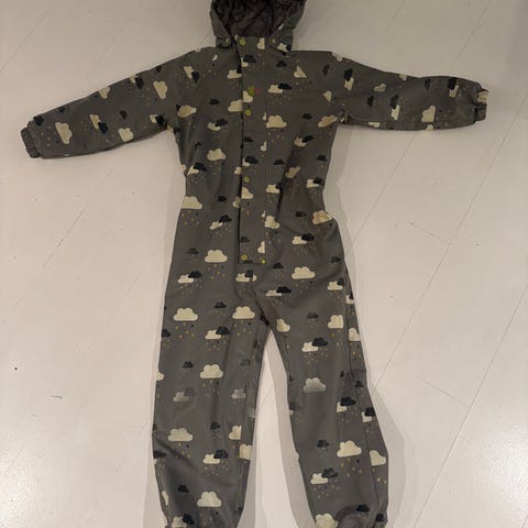Grå Kattnakken fôret regndress i størrelse 128. Dressen er stor i størrelsen og har en hette. God til kalde dager om våren og høsten. Har en liten skrape på ene kneet, men virker vanntett enda. Tettelapper kan evt fås fra Kattnakken, jeg har gått tom.