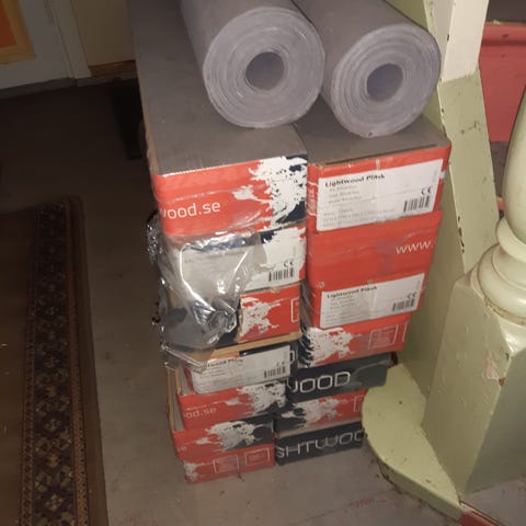 Gulv på ca 20 kvm, noen få gulv bord er ødelagt, men jeg har en hel pakke av samme gulv som ikke er åpnet, så da går det ann å bytte de få som er ødelagt..