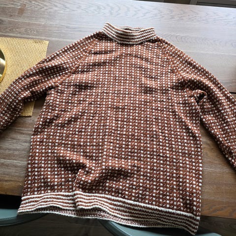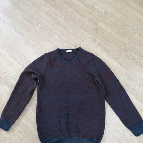 Peak Performance ullgenser i størrelse M for herre. Genseren har en flerfarget mønsterdesign i mørk blå og orange og er laget av myk ull. Den har rund hals og ribbestrikkede kanter ved ermer og liv, samt forsterkninger på albuer.