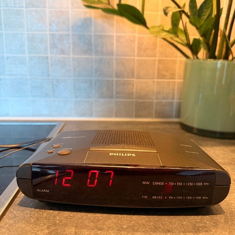 Vekker deg med lys og lyd. Du kan velge mellom forhåndsinnstilte lyder (f.eks fuglekvitter) eller FM-radio