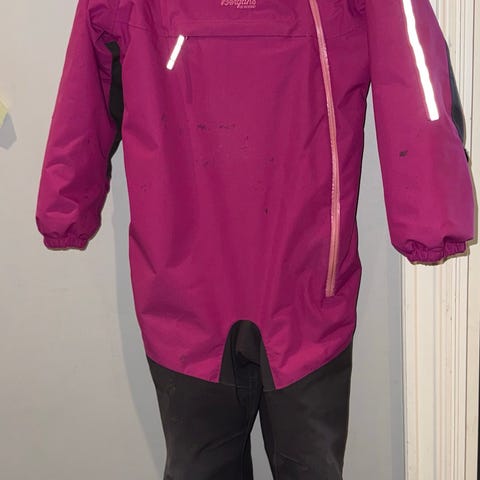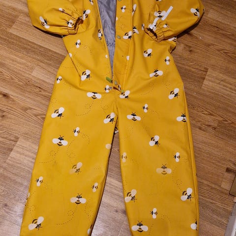 Gul Kattnakken fôret regnress i størrelse. Dressen er stor i størrelsen, har hette og elastisk midje for bedre passform. Holder på varmen og er god å bruke høst og vår. Den har to tettede hull på knærne og er fortsatt vanntett. Glidelåsen er i god stand og den har nye støvelstrikker.